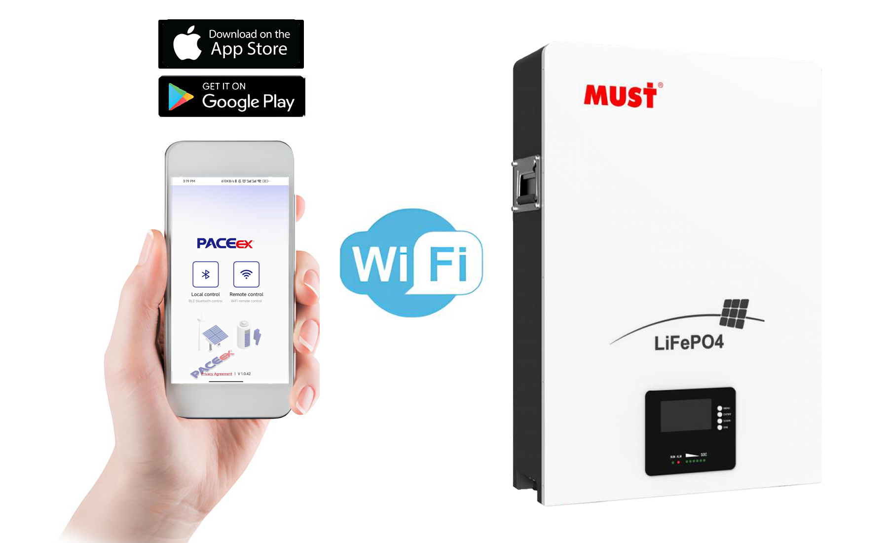 У аккумулятора LiFePO4 MUST 51.2-100 есть возможность удаленного мониторинга по Wi-Fi. У Вас будет возможность управления аккумулятором, просматривать состояние батареи, а также регистрировать, диагностировать и оповещать о состоянии батареи в режиме реального времени с использованием смартфона, планшета или компьютера в любое время и в любом месте.